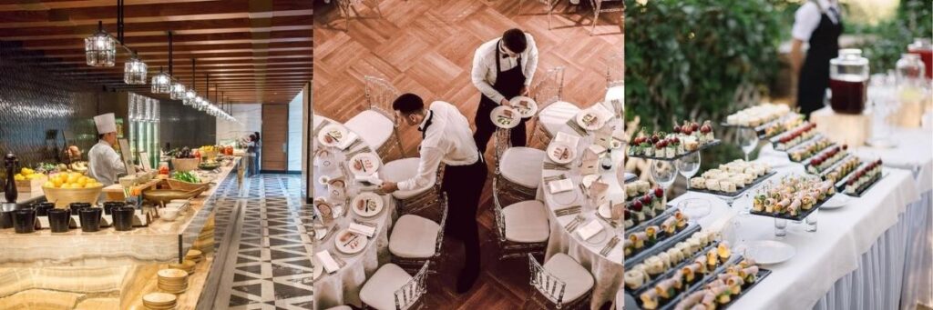 - Buffet: comida expuesta en estaciones o mesas, donde los invitados se sirven por sí mismos.
