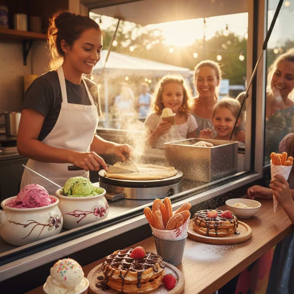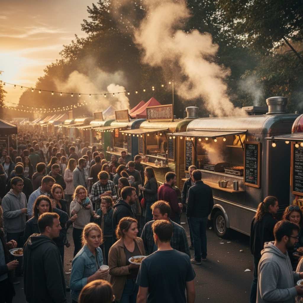 - Estaciones temáticas: un truck salado como foco (parrilla, smash burgers, tacos) + punto dulce (crepes o helados) y barra de bebidas para repartir el flujo.